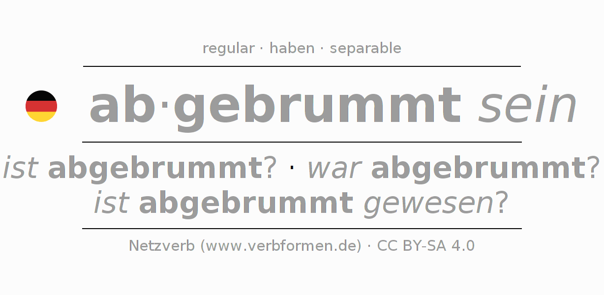 Clear online presentation of the verb 'ab·gebrummt sein' including all verb forms. Therfore, the flection of the verb ab·gebrummt sein can be useful for homework, tests, exams, German lessons in school, learning German, during studies and adult education. Especially for people learning German it is essential to know the correct flection of a verb (ist abgebrummt? - war abgebrummt? - ist abgebrummt gewesen?).