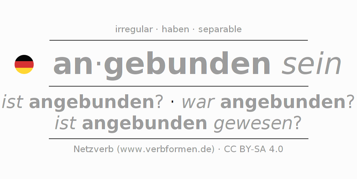 - Future: werde ich angebunden sein?, werdest du angebunden sein?, werde er angebunden sein?, werden wir angebunden sein?, werdet ihr angebunden sein?, werden sie angebunden sein?