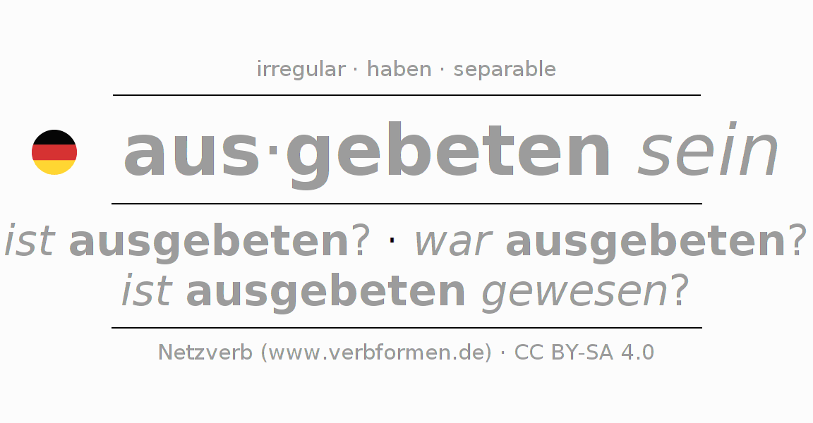- Future Perfect: werde ich ausgebeten gewesen sein?, wirst du ausgebeten gewesen sein?, wird er ausgebeten gewesen sein?, werden wir ausgebeten gewesen sein?, werdet ihr ausgebeten gewesen sein?, werden sie ausgebeten gewesen sein?