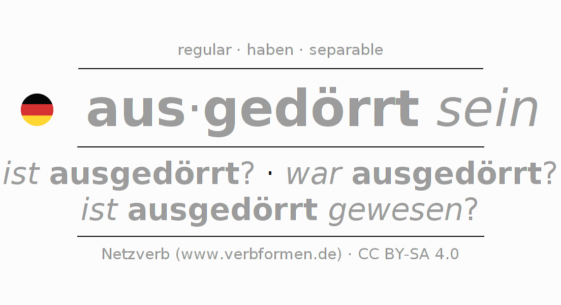 - Future: werde ich ausgedörrt sein?, wirst du ausgedörrt sein?, wird er ausgedörrt sein?, werden wir ausgedörrt sein?, werdet ihr ausgedörrt sein?, werden sie ausgedörrt sein?