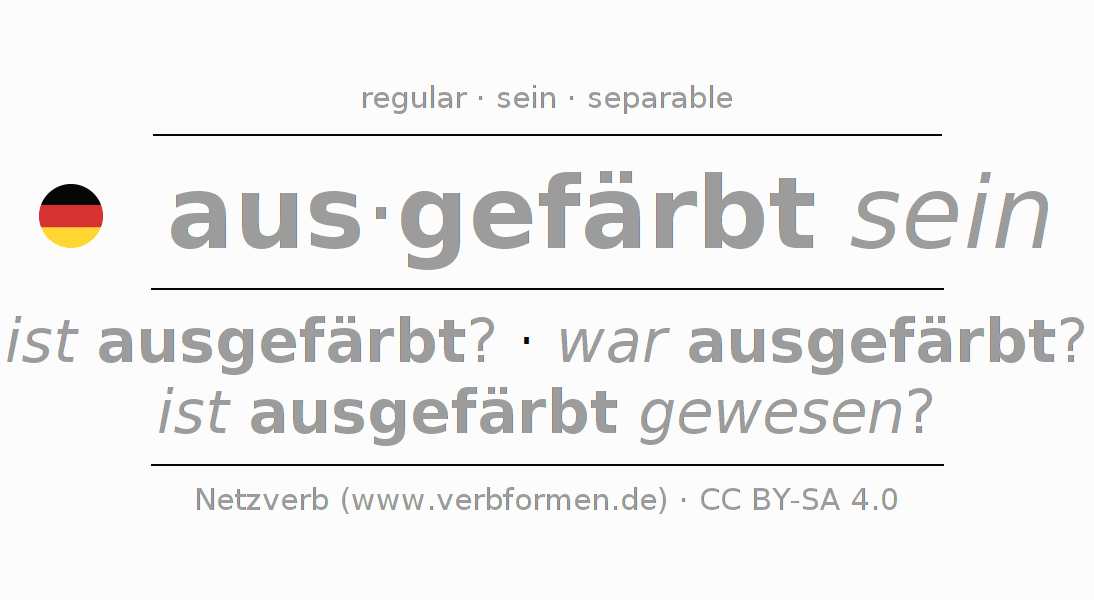 - Perfect: bin ich ausgefärbt gewesen?, bist du ausgefärbt gewesen?, ist er ausgefärbt gewesen?, sind wir ausgefärbt gewesen?, seid ihr ausgefärbt gewesen?, sind sie ausgefärbt gewesen?