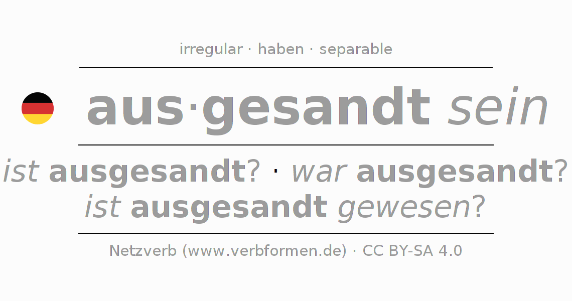 - Future Perfect: werde ich ausgesandt gewesen sein?, werdest du ausgesandt gewesen sein?, werde er ausgesandt gewesen sein?, werden wir ausgesandt gewesen sein?, werdet ihr ausgesandt gewesen sein?, werden sie ausgesandt gewesen sein?