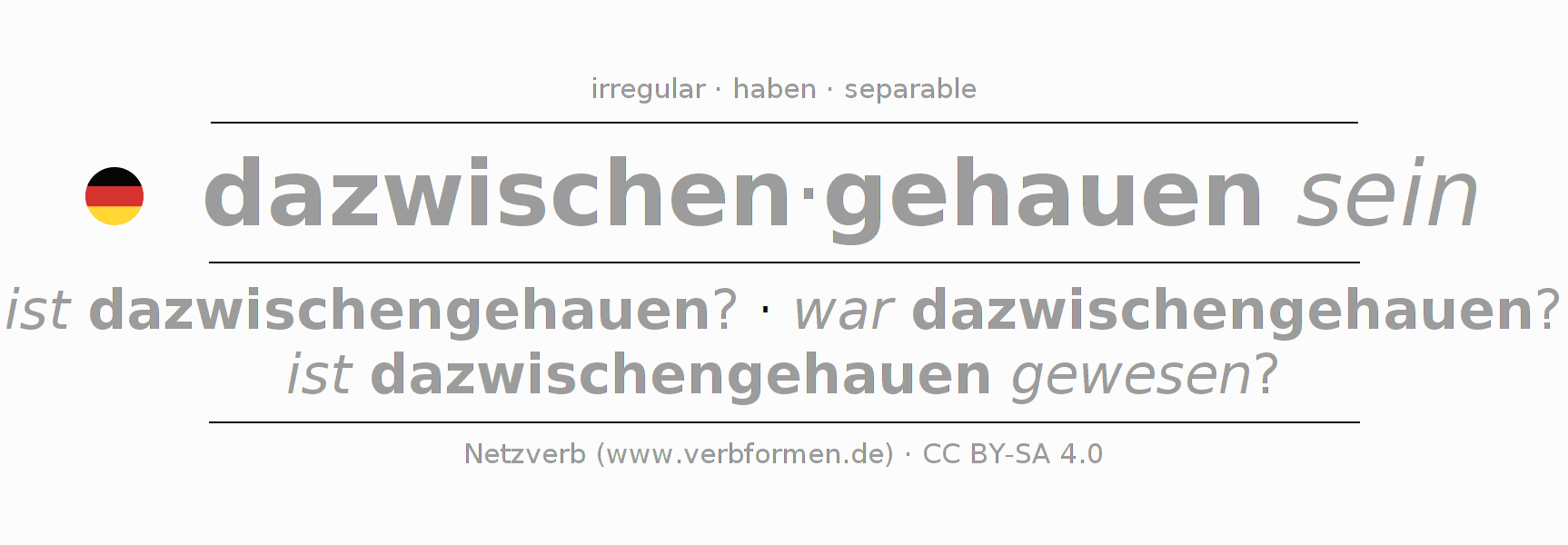 - Future: werde ich dazwischengehau(e)n sein?, werdest du dazwischengehau(e)n sein?, werde er dazwischengehau(e)n sein?, werden wir dazwischengehau(e)n sein?, werdet ihr dazwischengehau(e)n sein?, werden sie dazwischengehau(e)n sein?