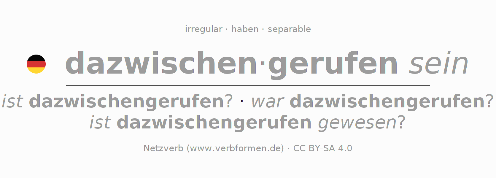- Future Perfect: werde ich dazwischengerufen gewesen sein?, wirst du dazwischengerufen gewesen sein?, wird er dazwischengerufen gewesen sein?, werden wir dazwischengerufen gewesen sein?, werdet ihr dazwischengerufen gewesen sein?, werden sie dazwischengerufen gewesen sein?