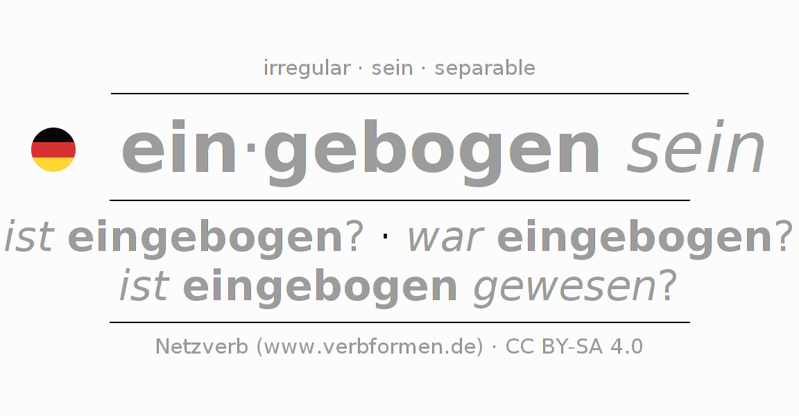 Clear online presentation of the verb 'ein·gebogen sein' including all verb forms. Therfore, the flection of the verb ein·gebogen sein can be useful for homework, tests, exams, German lessons in school, learning German, during studies and adult education. Especially for people learning German it is essential to know the correct flection of a verb (ist eingebogen? - war eingebogen? - ist eingebogen gewesen?).
