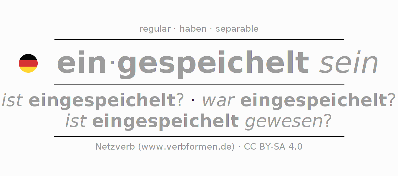 - Future Perfect: werde ich eingespeichelt gewesen sein?, wirst du eingespeichelt gewesen sein?, wird er eingespeichelt gewesen sein?, werden wir eingespeichelt gewesen sein?, werdet ihr eingespeichelt gewesen sein?, werden sie eingespeichelt gewesen sein?