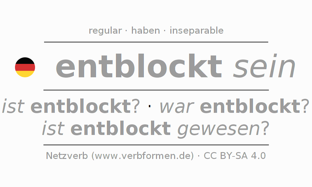 - Present: bin ich entblockt?, bist du entblockt?, ist er entblockt?, sind wir entblockt?, seid ihr entblockt?, sind sie entblockt?