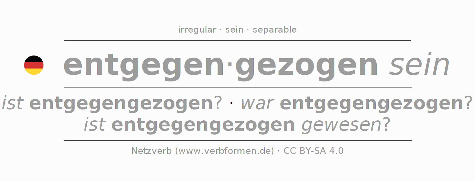 - Future Perfect: werde ich entgegengezogen gewesen sein?, wirst du entgegengezogen gewesen sein?, wird er entgegengezogen gewesen sein?, werden wir entgegengezogen gewesen sein?, werdet ihr entgegengezogen gewesen sein?, werden sie entgegengezogen gewesen sein?