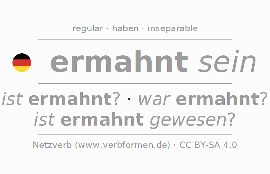- Future: werde ich ermahnt sein?, wirst du ermahnt sein?, wird er ermahnt sein?, werden wir ermahnt sein?, werdet ihr ermahnt sein?, werden sie ermahnt sein?