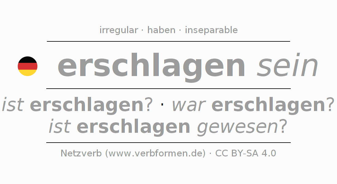 Clear online presentation of the verb 'erschlagen sein' including all verb forms. Therfore, the flection of the verb erschlagen sein can be useful for homework, tests, exams, German lessons in school, learning German, during studies and adult education. Especially for people learning German it is essential to know the correct flection of a verb (ist erschlagen? - war erschlagen? - ist erschlagen gewesen?).