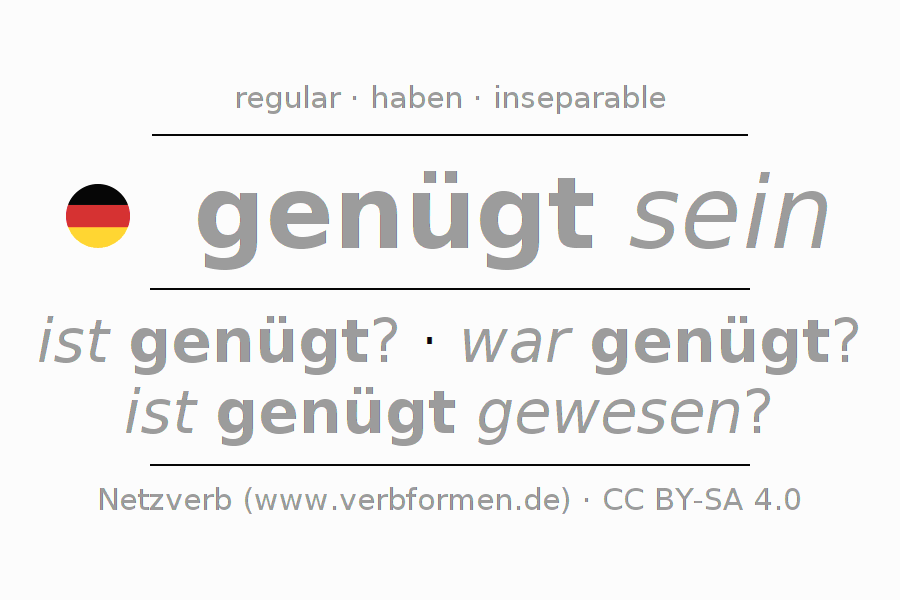 - Future: werde ich genügt sein?, wirst du genügt sein?, wird er genügt sein?, werden wir genügt sein?, werdet ihr genügt sein?, werden sie genügt sein?
