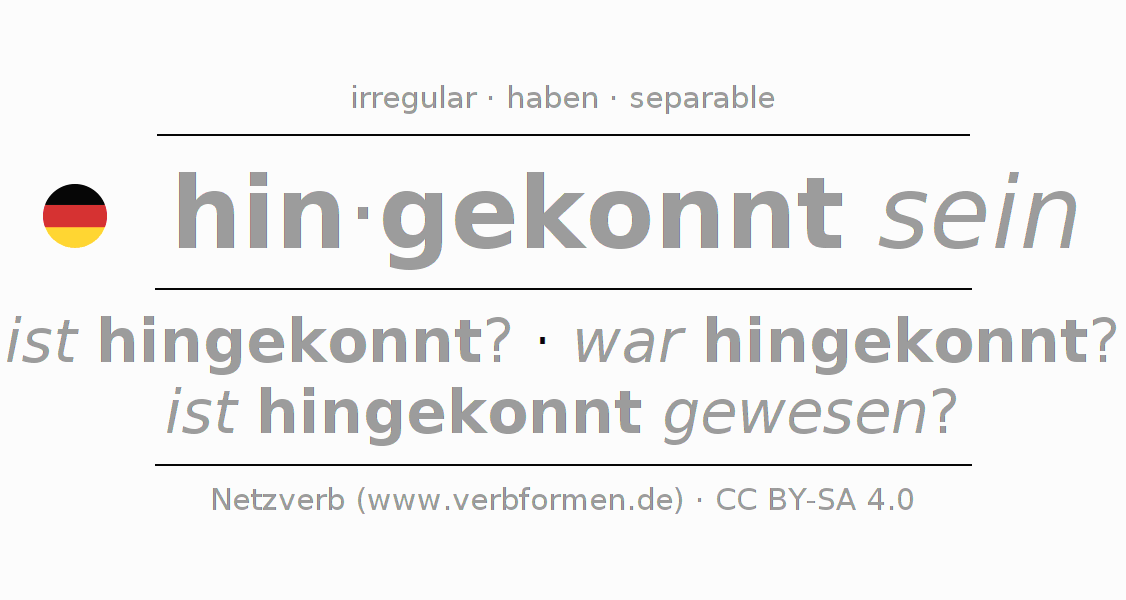 The conjugation of the verb hinkönnen (get to, reach) is irregular. Basic forms are ist hingekonnt?, war hingekonnt? and ist hingekonnt gewesen?. The auxiliary verb of hinkönnen is haben. First syllable hin- of hinkönnen is separable. The flection is in Statal Passive and the use as Interrogative. For a better understanding, countless examples of the verb hinkönnen are available. For practicing and consolidating, there are also free worksheets for hinkönnen. You can not just hinkönnen conjugate, but all German verbs. Comments ☆