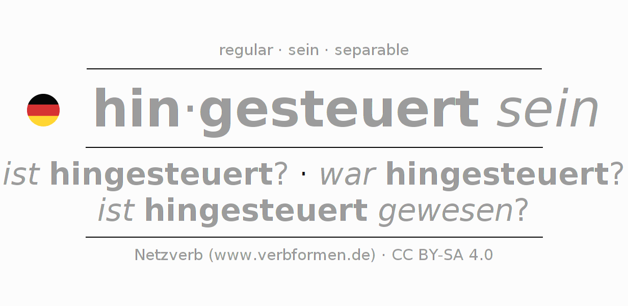 - Future Perfect: werde ich hingesteuert gewesen sein?, wirst du hingesteuert gewesen sein?, wird er hingesteuert gewesen sein?, werden wir hingesteuert gewesen sein?, werdet ihr hingesteuert gewesen sein?, werden sie hingesteuert gewesen sein?