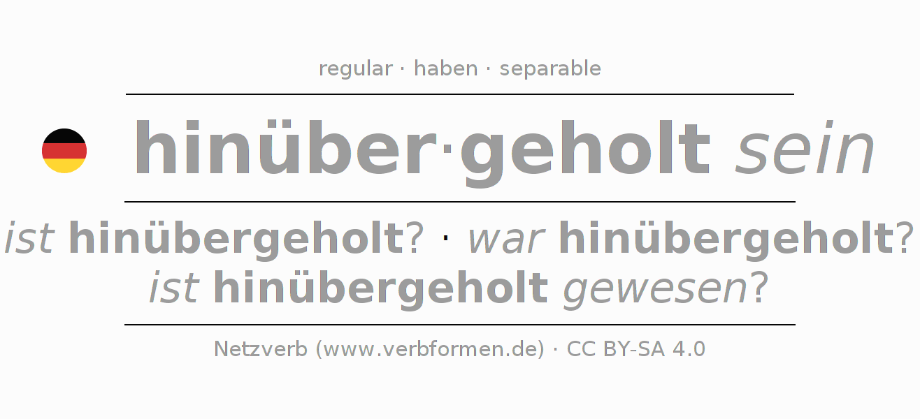 - Present: bin ich hinübergeholt?, bist du hinübergeholt?, ist er hinübergeholt?, sind wir hinübergeholt?, seid ihr hinübergeholt?, sind sie hinübergeholt?