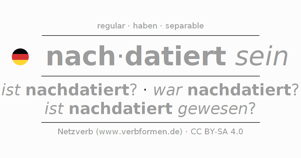 - Future Perfect: werde ich nachdatiert gewesen sein?, wirst du nachdatiert gewesen sein?, wird er nachdatiert gewesen sein?, werden wir nachdatiert gewesen sein?, werdet ihr nachdatiert gewesen sein?, werden sie nachdatiert gewesen sein?