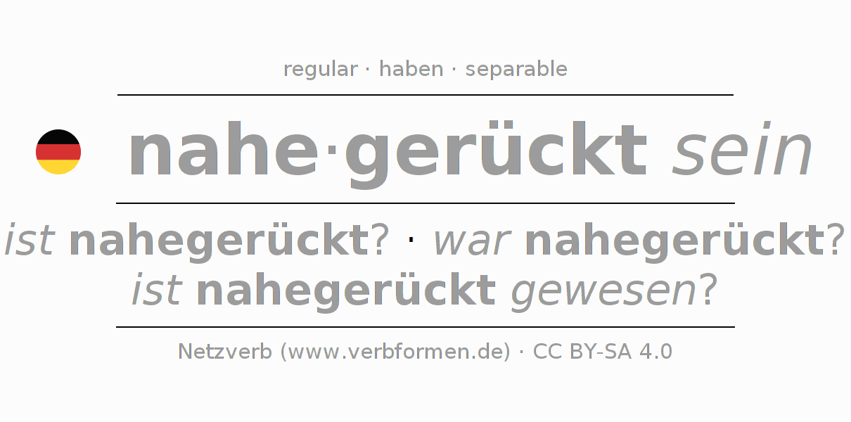 - Perfect: bin ich nahegerückt gewesen?, bist du nahegerückt gewesen?, ist er nahegerückt gewesen?, sind wir nahegerückt gewesen?, seid ihr nahegerückt gewesen?, sind sie nahegerückt gewesen?