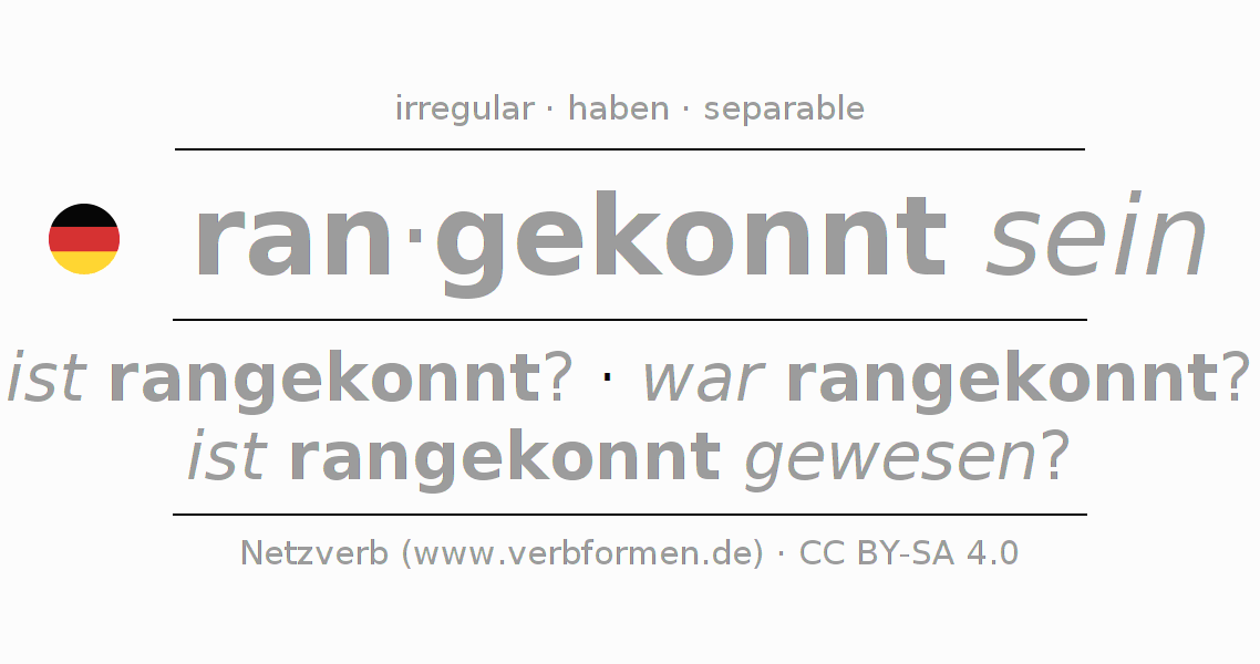 - Present: bin ich rangekonnt?, bist du rangekonnt?, ist er rangekonnt?, sind wir rangekonnt?, seid ihr rangekonnt?, sind sie rangekonnt?
