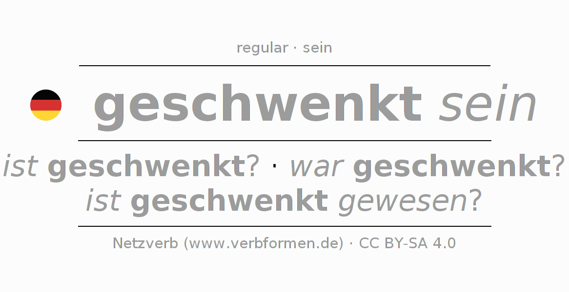 - Future: werde ich geschwenkt sein?, wirst du geschwenkt sein?, wird er geschwenkt sein?, werden wir geschwenkt sein?, werdet ihr geschwenkt sein?, werden sie geschwenkt sein?