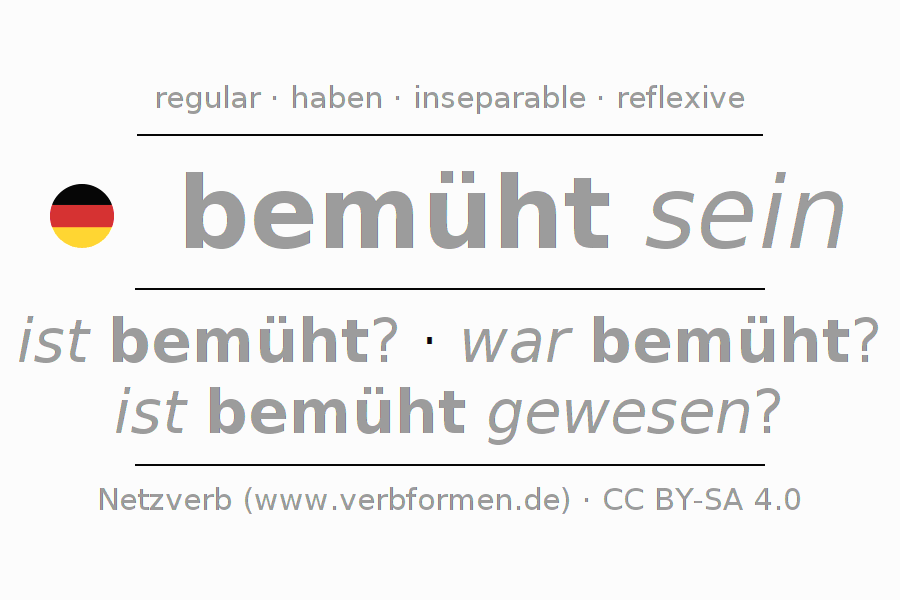Clear online presentation of the verb 'bemüht sein' including all verb forms. Therfore, the flection of the verb bemüht sein can be useful for homework, tests, exams, German lessons in school, learning German, during studies and adult education. Especially for people learning German it is essential to know the correct flection of a verb (ist bemüht? - war bemüht? - ist bemüht gewesen?).