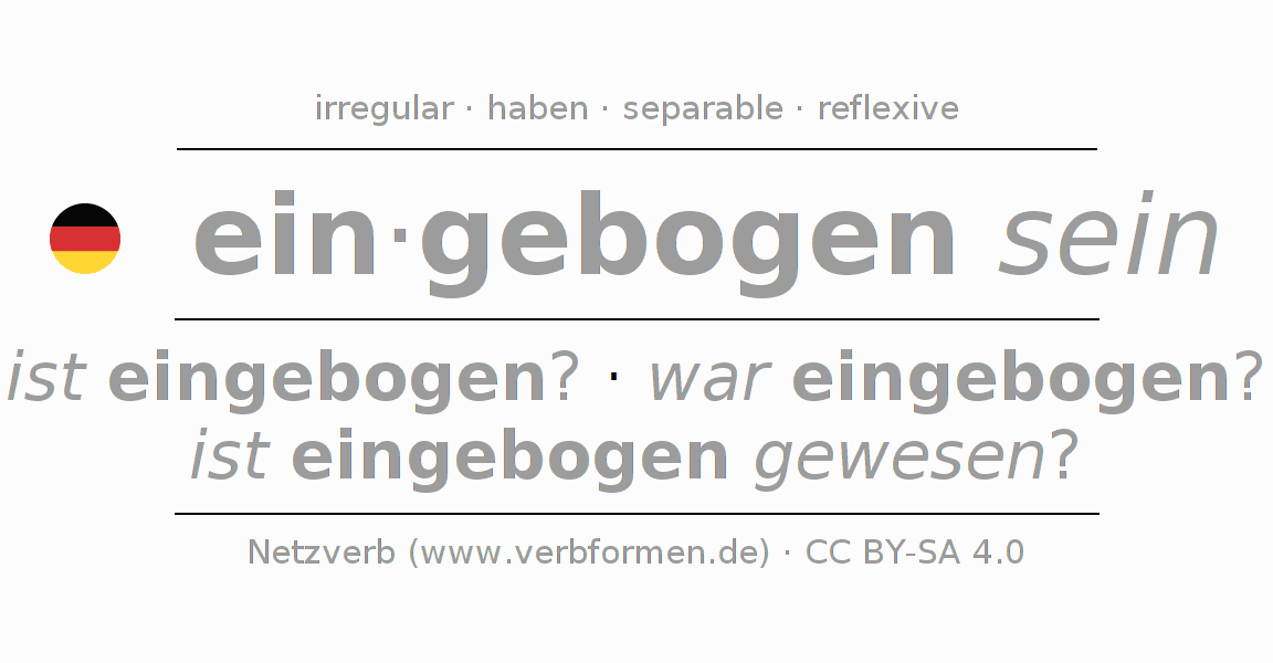 - Future Perfect: werde ich eingebogen gewesen sein?, wirst du eingebogen gewesen sein?, wird er eingebogen gewesen sein?, werden wir eingebogen gewesen sein?, werdet ihr eingebogen gewesen sein?, werden sie eingebogen gewesen sein?