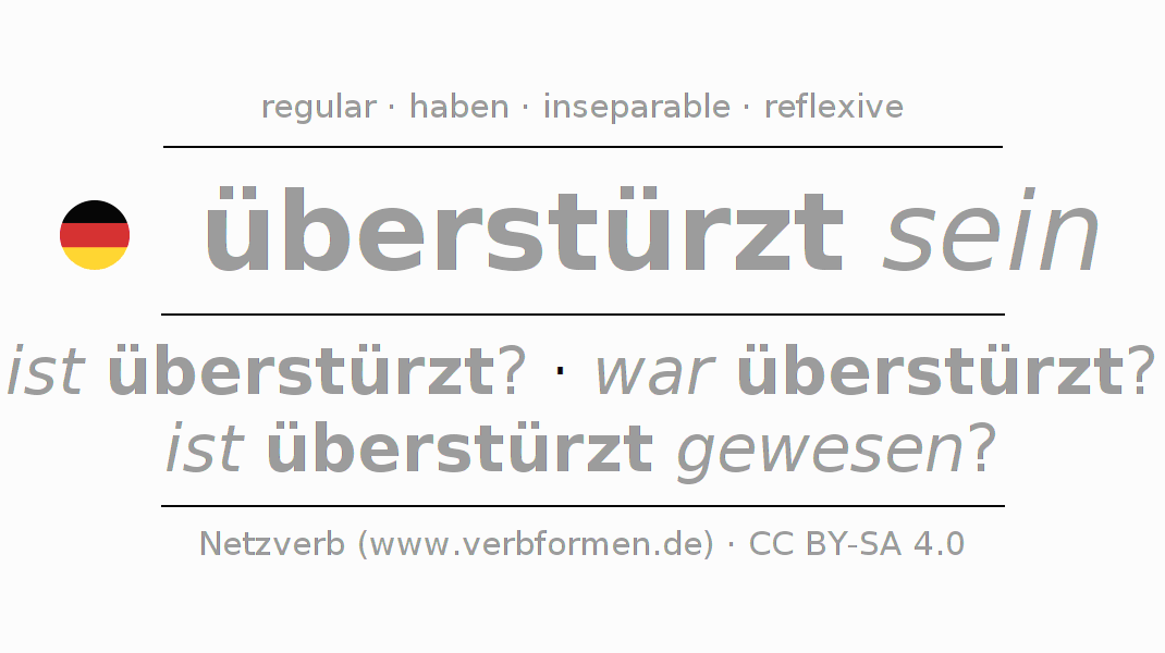 Clear online presentation of the verb 'überstürzt sein' including all verb forms. Therfore, the flection of the verb überstürzt sein can be useful for homework, tests, exams, German lessons in school, learning German, during studies and adult education. Especially for people learning German it is essential to know the correct flection of a verb (ist überstürzt? - war überstürzt? - ist überstürzt gewesen?).