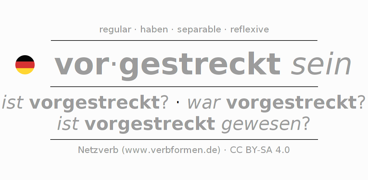 - Future Perfect: werde ich vorgestreckt gewesen sein?, werdest du vorgestreckt gewesen sein?, werde er vorgestreckt gewesen sein?, werden wir vorgestreckt gewesen sein?, werdet ihr vorgestreckt gewesen sein?, werden sie vorgestreckt gewesen sein?