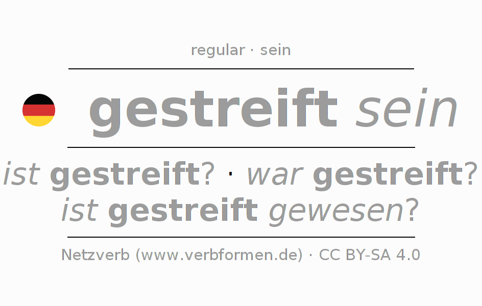 Clear online presentation of the verb 'gestreift sein' including all verb forms. Therfore, the flection of the verb gestreift sein can be useful for homework, tests, exams, German lessons in school, learning German, during studies and adult education. Especially for people learning German it is essential to know the correct flection of a verb (ist gestreift? - war gestreift? - ist gestreift gewesen?).
