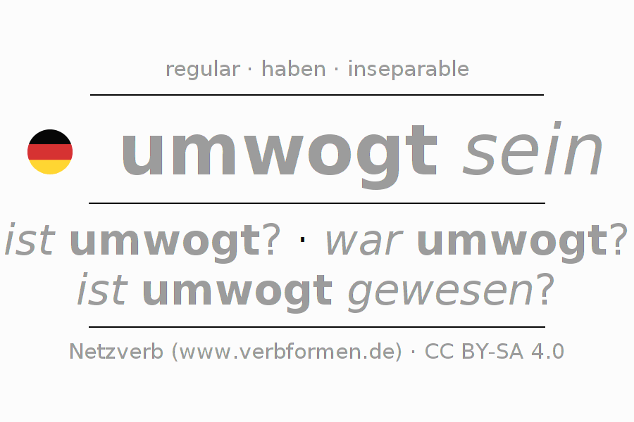 Clear online presentation of the verb 'umwogt sein' including all verb forms. Therfore, the flection of the verb umwogt sein can be useful for homework, tests, exams, German lessons in school, learning German, during studies and adult education. Especially for people learning German it is essential to know the correct flection of a verb (ist umwogt? - war umwogt? - ist umwogt gewesen?).