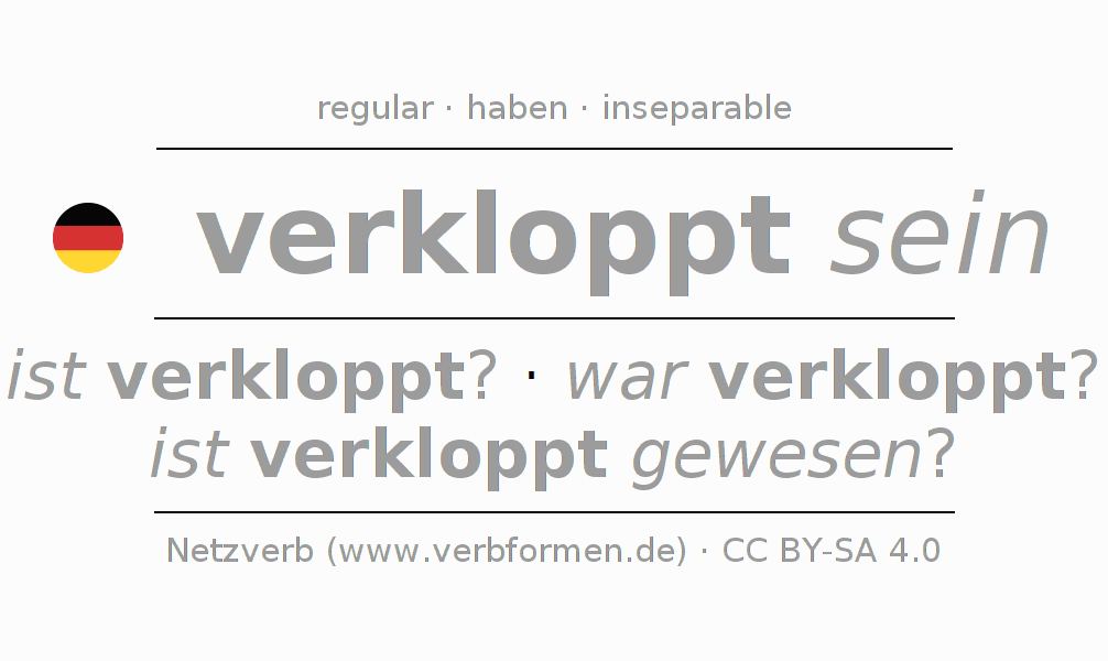 - Present: bin ich verkloppt?, bist du verkloppt?, ist er verkloppt?, sind wir verkloppt?, seid ihr verkloppt?, sind sie verkloppt?