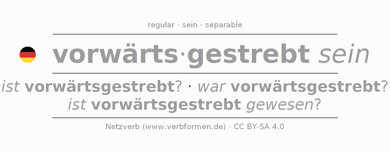 - Future: werde ich vorwärtsgestrebt sein?, wirst du vorwärtsgestrebt sein?, wird er vorwärtsgestrebt sein?, werden wir vorwärtsgestrebt sein?, werdet ihr vorwärtsgestrebt sein?, werden sie vorwärtsgestrebt sein?