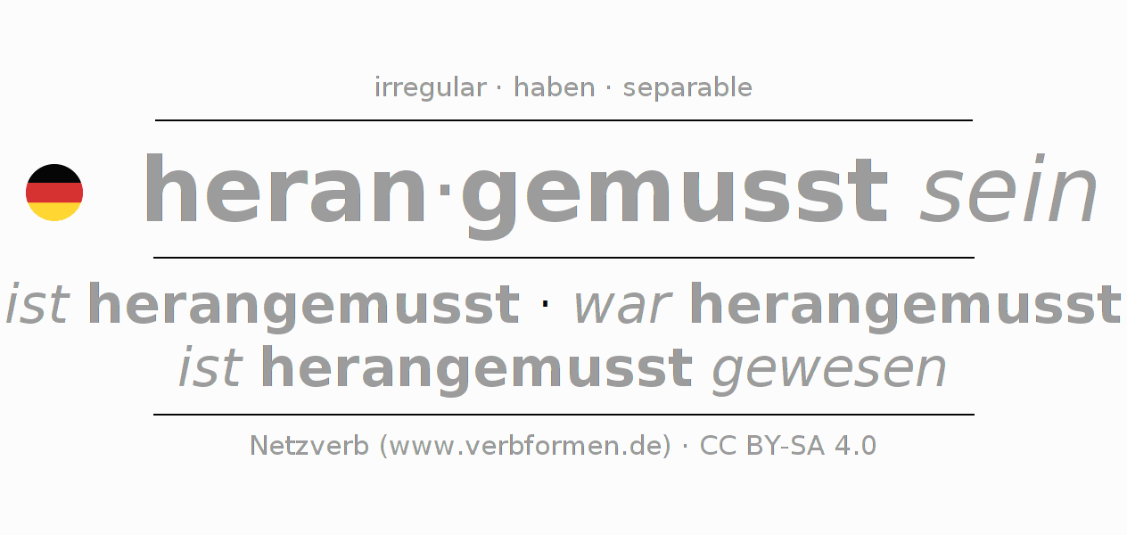 - Future Perfect: ich werde herangemusst gewesen sein, du wirst herangemusst gewesen sein, er wird herangemusst gewesen sein, wir werden herangemusst gewesen sein, ihr werdet herangemusst gewesen sein, sie werden herangemusst gewesen sein