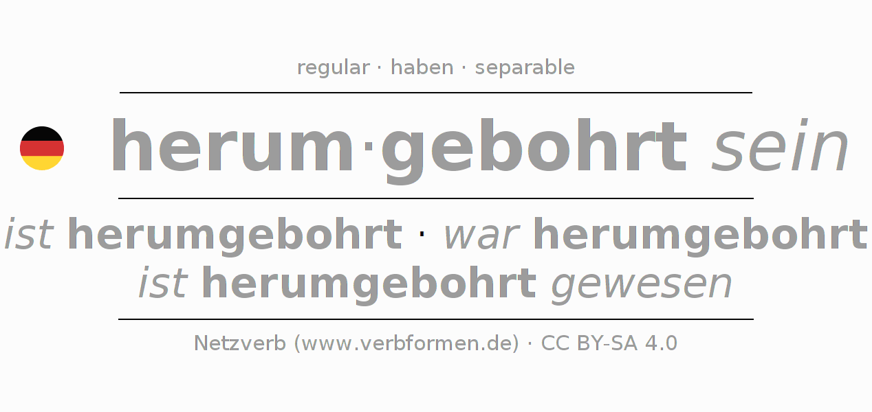 The conjugation of the verb herumbohren (drill, poke around) is regular. Basic forms are ist herumgebohrt, war herumgebohrt and ist herumgebohrt gewesen. The auxiliary verb of herumbohren is haben. First syllable herum- of herumbohren is separable. The flection is in Statal Passive and the use as Main. For a better understanding, countless examples of the verb herumbohren are available. For practicing and consolidating, there are also free worksheets for herumbohren. You can not just herumbohren conjugate, but all German verbs. Comments ☆