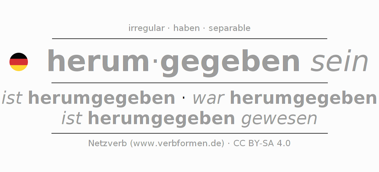 - Future: ich werde herumgegeben sein, du werdest herumgegeben sein, er werde herumgegeben sein, wir werden herumgegeben sein, ihr werdet herumgegeben sein, sie werden herumgegeben sein
