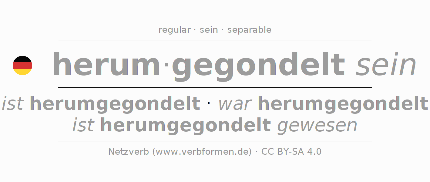 - Future Perfect: ich werde herumgegondelt gewesen sein, du werdest herumgegondelt gewesen sein, er werde herumgegondelt gewesen sein, wir werden herumgegondelt gewesen sein, ihr werdet herumgegondelt gewesen sein, sie werden herumgegondelt gewesen sein