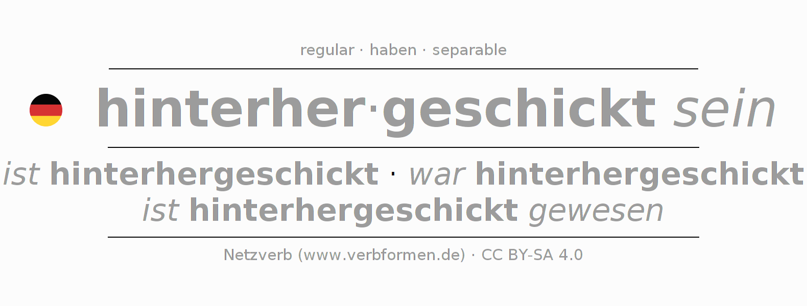 - Future Perfect: ich werde hinterhergeschickt gewesen sein, du werdest hinterhergeschickt gewesen sein, er werde hinterhergeschickt gewesen sein, wir werden hinterhergeschickt gewesen sein, ihr werdet hinterhergeschickt gewesen sein, sie werden hinterhergeschickt gewesen sein