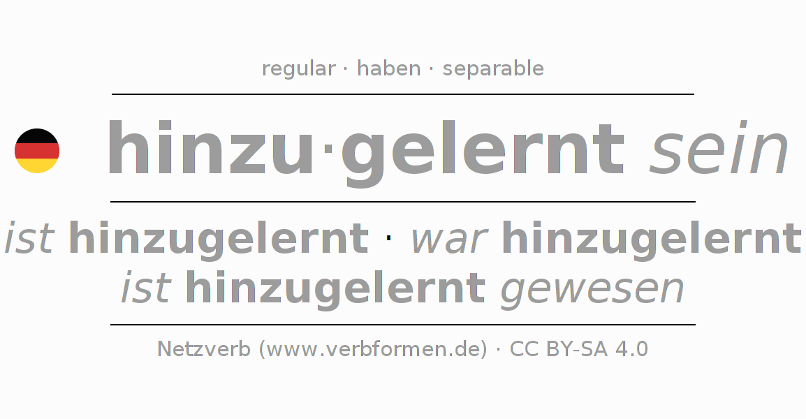 - Future: ich werde hinzugelernt sein, du werdest hinzugelernt sein, er werde hinzugelernt sein, wir werden hinzugelernt sein, ihr werdet hinzugelernt sein, sie werden hinzugelernt sein