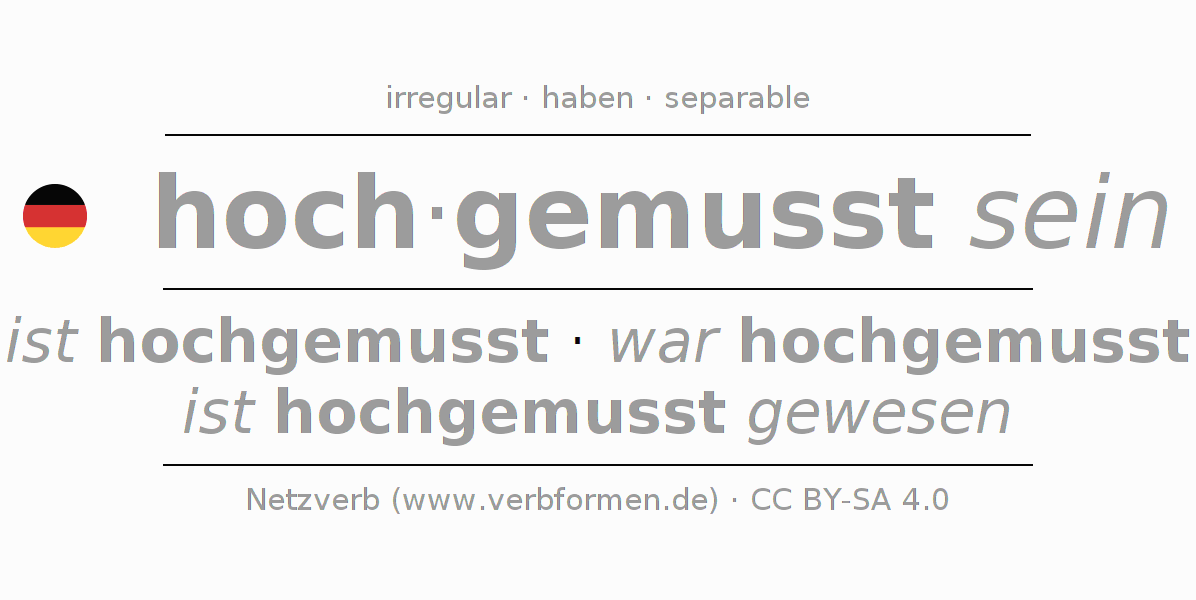 - Pluperfect: ich war hochgemusst gewesen, du warst hochgemusst gewesen, er war hochgemusst gewesen, wir waren hochgemusst gewesen, ihr wart hochgemusst gewesen, sie waren hochgemusst gewesen