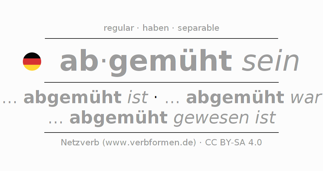 Clear online presentation of the verb 'ab·gemüht sein' including all verb forms. Therfore, the flection of the verb ab·gemüht sein can be useful for homework, tests, exams, German lessons in school, learning German, during studies and adult education. Especially for people learning German it is essential to know the correct flection of a verb (... abgemüht ist - ... abgemüht war - ... abgemüht gewesen ist).