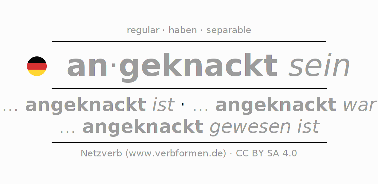 - Future: ... ich angeknackt sein werde, ... du angeknackt sein werdest, ... er angeknackt sein werde, ... wir angeknackt sein werden, ... ihr angeknackt sein werdet, ... sie angeknackt sein werden