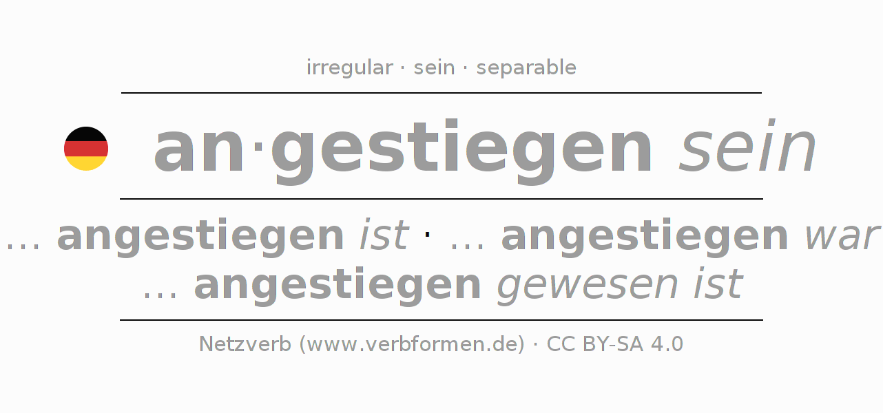 Clear online presentation of the verb 'an·gestiegen sein' including all verb forms. Therfore, the flection of the verb an·gestiegen sein can be useful for homework, tests, exams, German lessons in school, learning German, during studies and adult education. Especially for people learning German it is essential to know the correct flection of a verb (... angestiegen ist - ... angestiegen war - ... angestiegen gewesen ist).