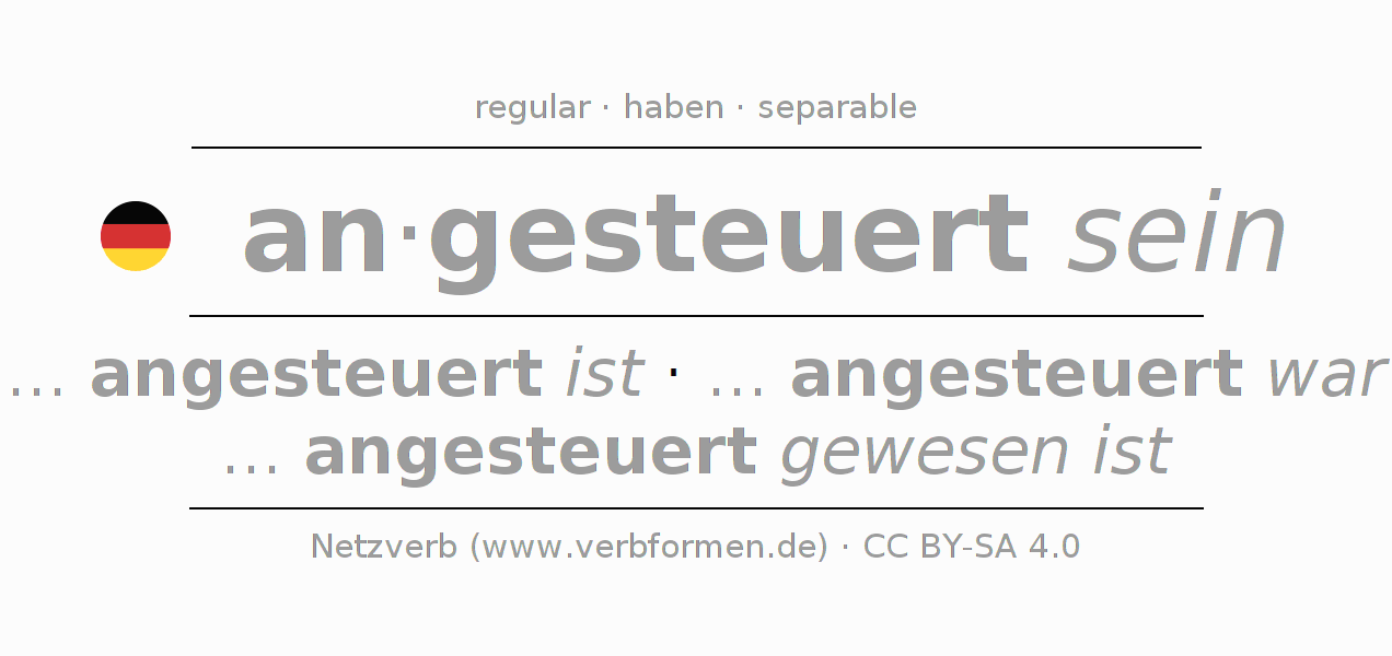 The conjugation of the verb ansteuern (energize, head for) is regular. Basic forms are ... angesteuert ist, ... angesteuert war and ... angesteuert gewesen ist. The auxiliary verb of ansteuern is haben. First syllable an- of ansteuern is separable. The flection is in Statal Passive and the use as Subordinate. For a better understanding, countless examples of the verb ansteuern are available. For practicing and consolidating, there are also free worksheets for ansteuern. You can not just ansteuern conjugate, but all German verbs. Comments ☆