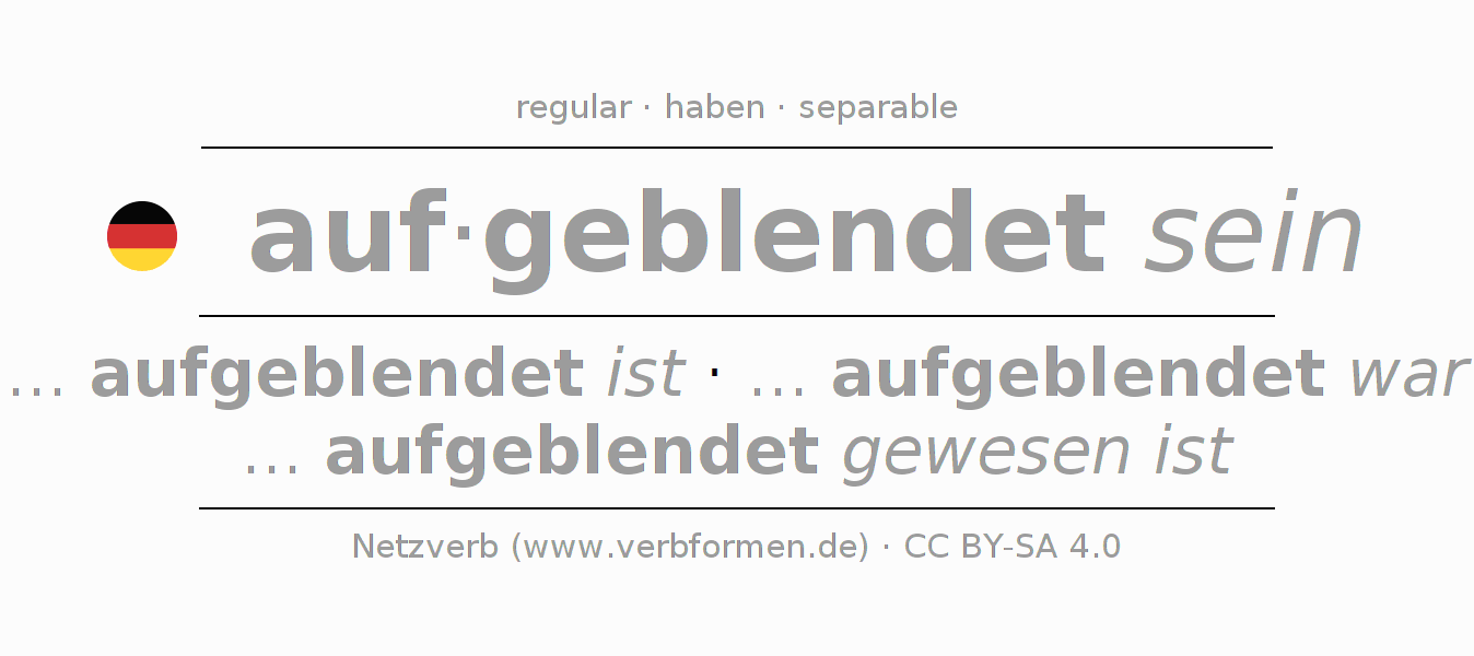 - Future: ... ich aufgeblendet sein werde, ... du aufgeblendet sein wirst, ... er aufgeblendet sein wird, ... wir aufgeblendet sein werden, ... ihr aufgeblendet sein werdet, ... sie aufgeblendet sein werden