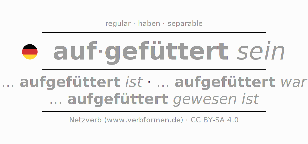 Clear online presentation of the verb 'auf·gefüttert sein' including all verb forms. Therfore, the flection of the verb auf·gefüttert sein can be useful for homework, tests, exams, German lessons in school, learning German, during studies and adult education. Especially for people learning German it is essential to know the correct flection of a verb (... aufgefüttert ist - ... aufgefüttert war - ... aufgefüttert gewesen ist).