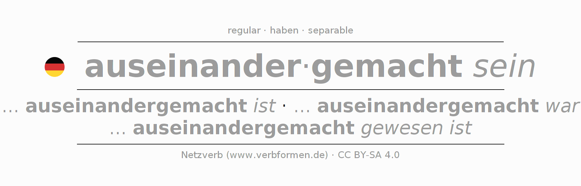 - Infinitive I: auseinandergemacht sein, auseinandergemacht zu sein