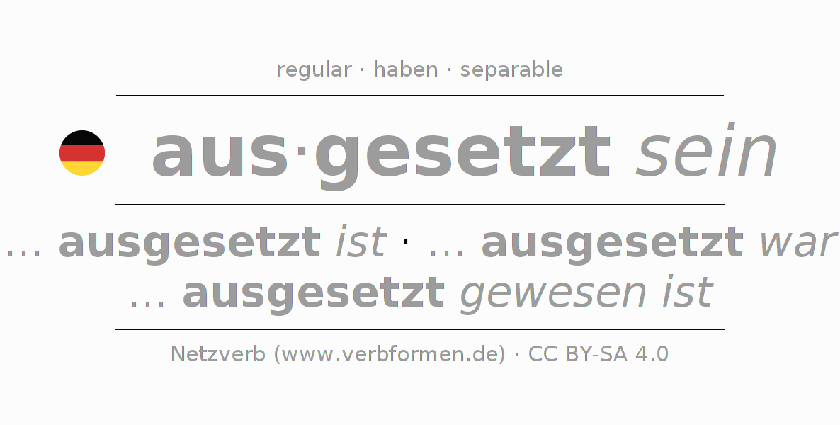 Clear online presentation of the verb 'aus·gesetzt sein' including all verb forms. Therfore, the flection of the verb aus·gesetzt sein can be useful for homework, tests, exams, German lessons in school, learning German, during studies and adult education. Especially for people learning German it is essential to know the correct flection of a verb (... ausgesetzt ist - ... ausgesetzt war - ... ausgesetzt gewesen ist).