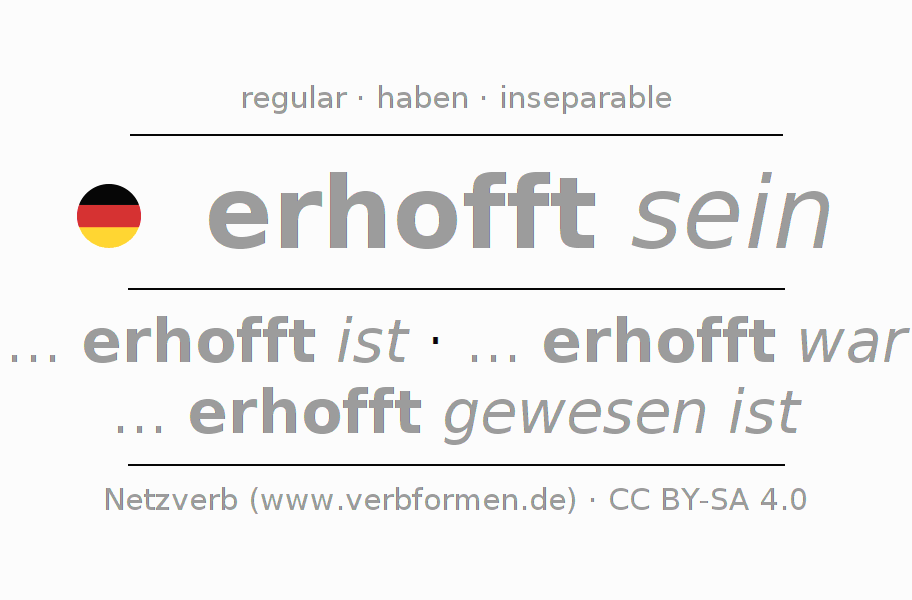 Clear online presentation of the verb 'erhofft sein' including all verb forms. Therfore, the flection of the verb erhofft sein can be useful for homework, tests, exams, German lessons in school, learning German, during studies and adult education. Especially for people learning German it is essential to know the correct flection of a verb (... erhofft ist - ... erhofft war - ... erhofft gewesen ist).