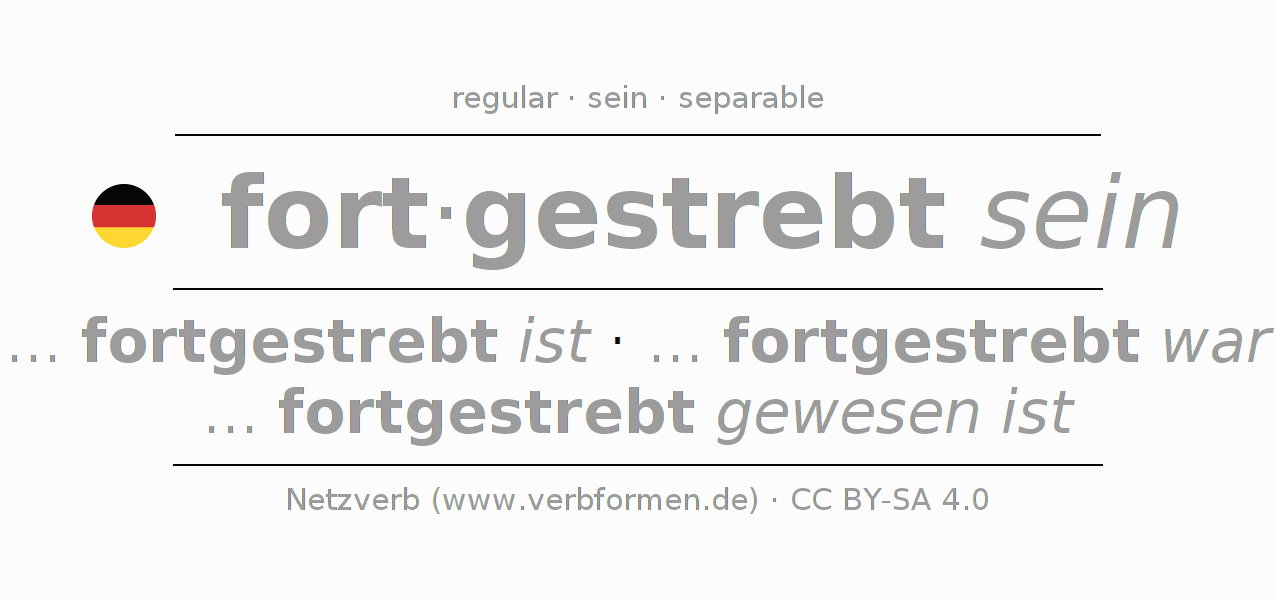 The conjugation of the verb fortstreben (aspire, longing) is regular. Basic forms are ... fortgestrebt ist, ... fortgestrebt war and ... fortgestrebt gewesen ist. The auxiliary verb of fortstreben is sein. First syllable fort- of fortstreben is separable. The flection is in Statal Passive and the use as Subordinate. For a better understanding, countless examples of the verb fortstreben are available. For practicing and consolidating, there are also free worksheets for fortstreben. You can not just fortstreben conjugate, but all German verbs. Comments ☆