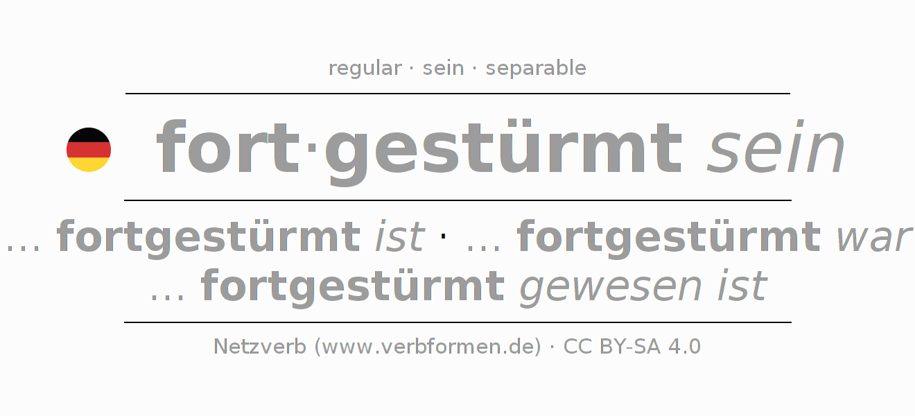 - Future: ... ich fortgestürmt sein werde, ... du fortgestürmt sein werdest, ... er fortgestürmt sein werde, ... wir fortgestürmt sein werden, ... ihr fortgestürmt sein werdet, ... sie fortgestürmt sein werden