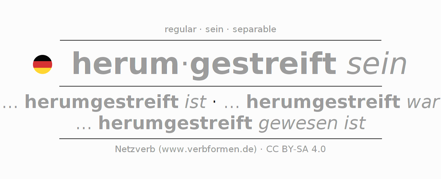 Clear online presentation of the verb 'herum·gestreift sein' including all verb forms. Therfore, the flection of the verb herum·gestreift sein can be useful for homework, tests, exams, German lessons in school, learning German, during studies and adult education. Especially for people learning German it is essential to know the correct flection of a verb (... herumgestreift ist - ... herumgestreift war - ... herumgestreift gewesen ist).