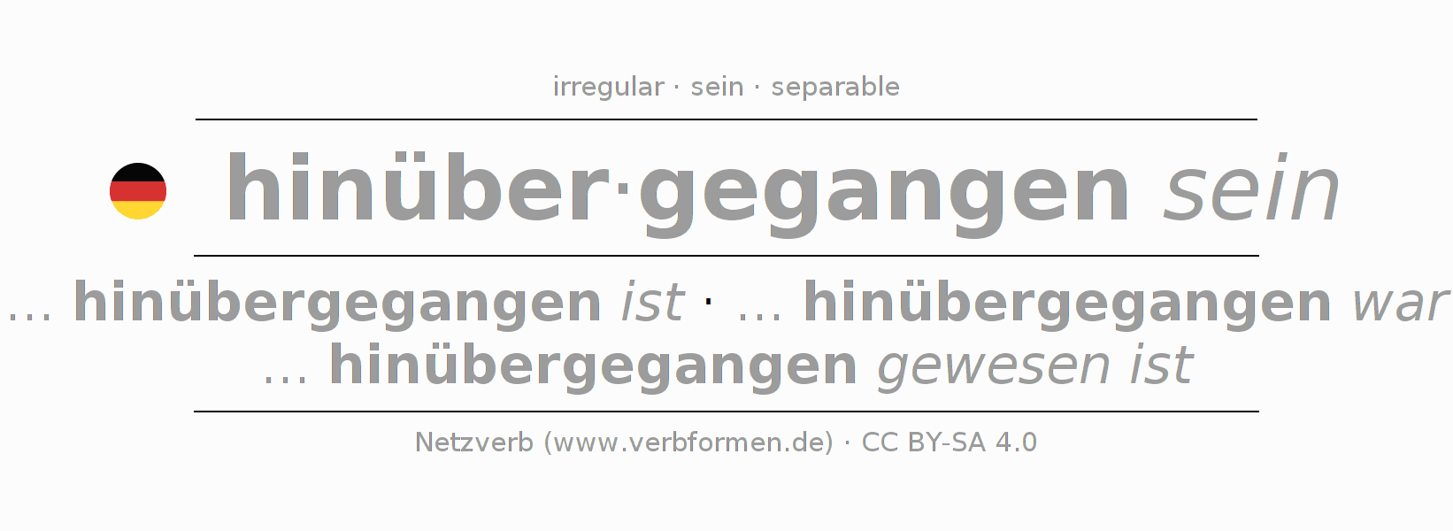 The conjugation of the verb hinübergehen (cross, go over) is irregular. Basic forms are ... hinübergegangen ist, ... hinübergegangen war and ... hinübergegangen gewesen ist. The stem vowels are e - i - a. The auxiliary verb of hinübergehen is sein. First syllable hinüber- of hinübergehen is separable. The flection is in Statal Passive and the use as Subordinate. For a better understanding, countless examples of the verb hinübergehen are available. For practicing and consolidating, there are also free worksheets for hinübergehen. You can not just hinübergehen conjugate, but all German verbs. Comments ☆